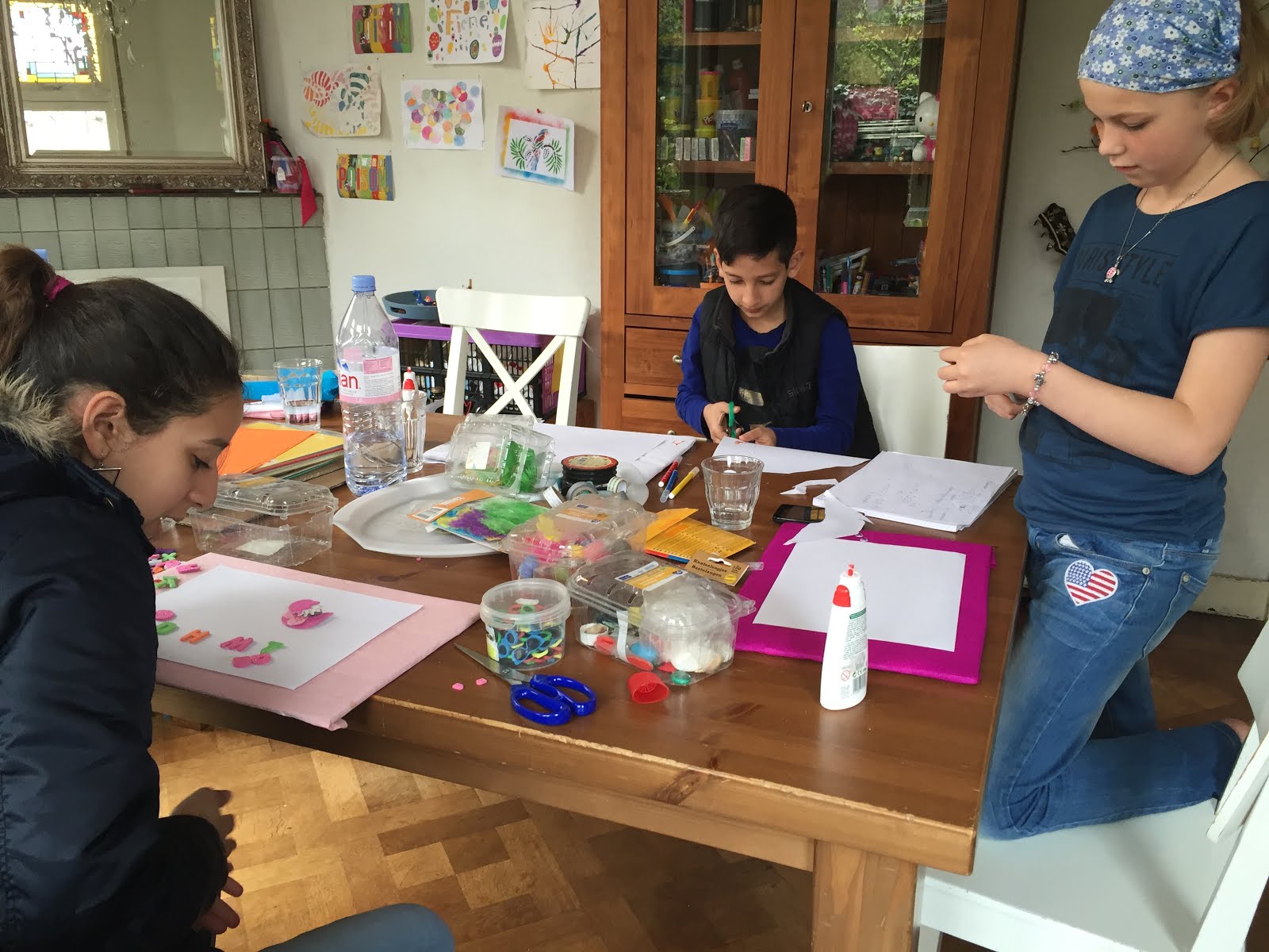 Het Syrische gezin dat bij ons had gelogeerd en daarna de verjaardag van de dochter bij ons thuis had gevierd, zit inmiddels in Leiderdorp, maar er is nog geen school beschikbaar voor de kinderen. Dus heb ik ze uitgenodigd om twee middagen in de week bij ons thuis mee te doen en Nederlands te oefenen. Een lief gepensioneerd echtpaar haalt ze op en brengt ze weer thuis. Vandaag kwamen ze voor het eerst!